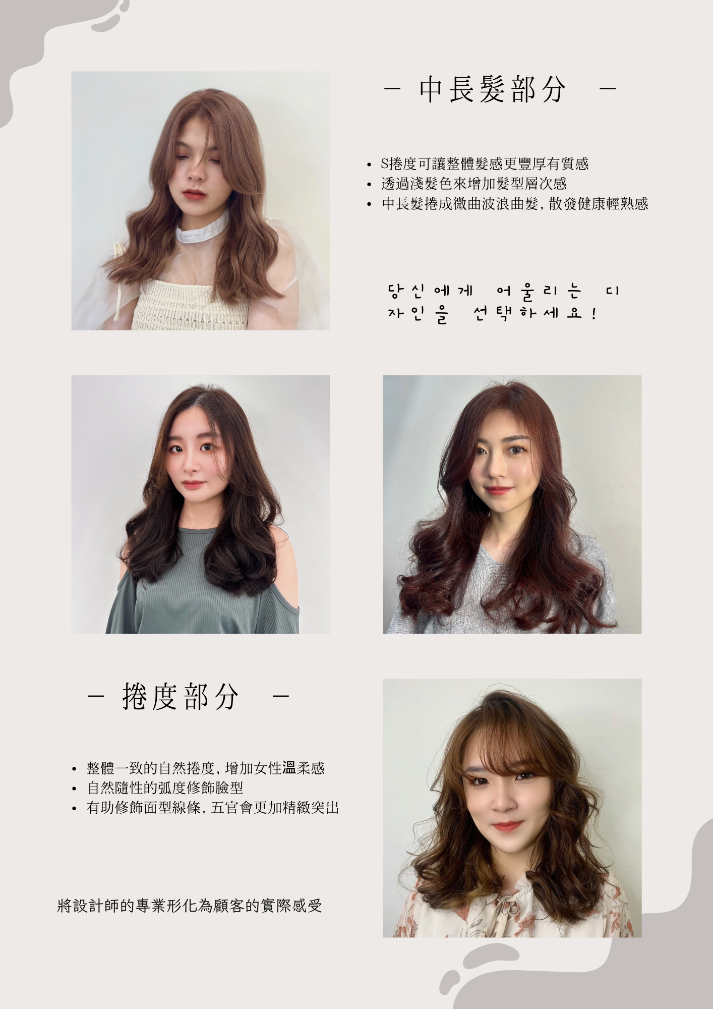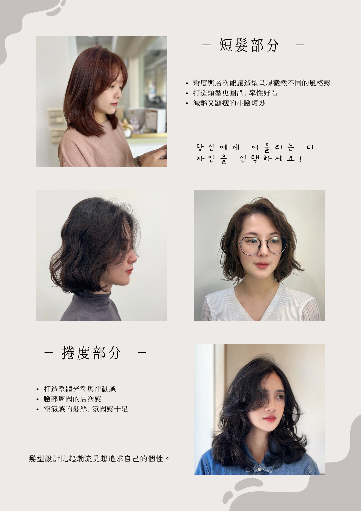 秋冬髮型就是要「溫柔中帶點細緻層次」! -髮型不只是髮型,而是你的隱形配件 用柔和的紋理、輕盈的層次讓你不論是隨性日常, 還是華麗登場都能成為目光焦點。 從俏皮捲度到慵懶低調的蓬鬆感, 我們的髮型目錄將為你展開這個季節最百搭的髮型靈感 一秒進入韓劇女主角的氛圍! 髮型的質感比以往更重要,特別是讓人無法抗拒的韓系風格升級 不僅滿足你對日常舒適度的期待,更給予你驚艷登場的造型靈感唷~ 點我看秋冬髮型店刊短片
